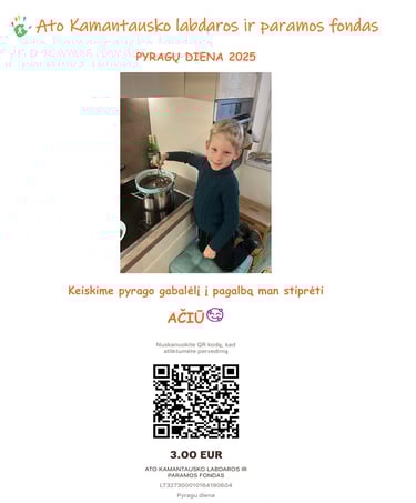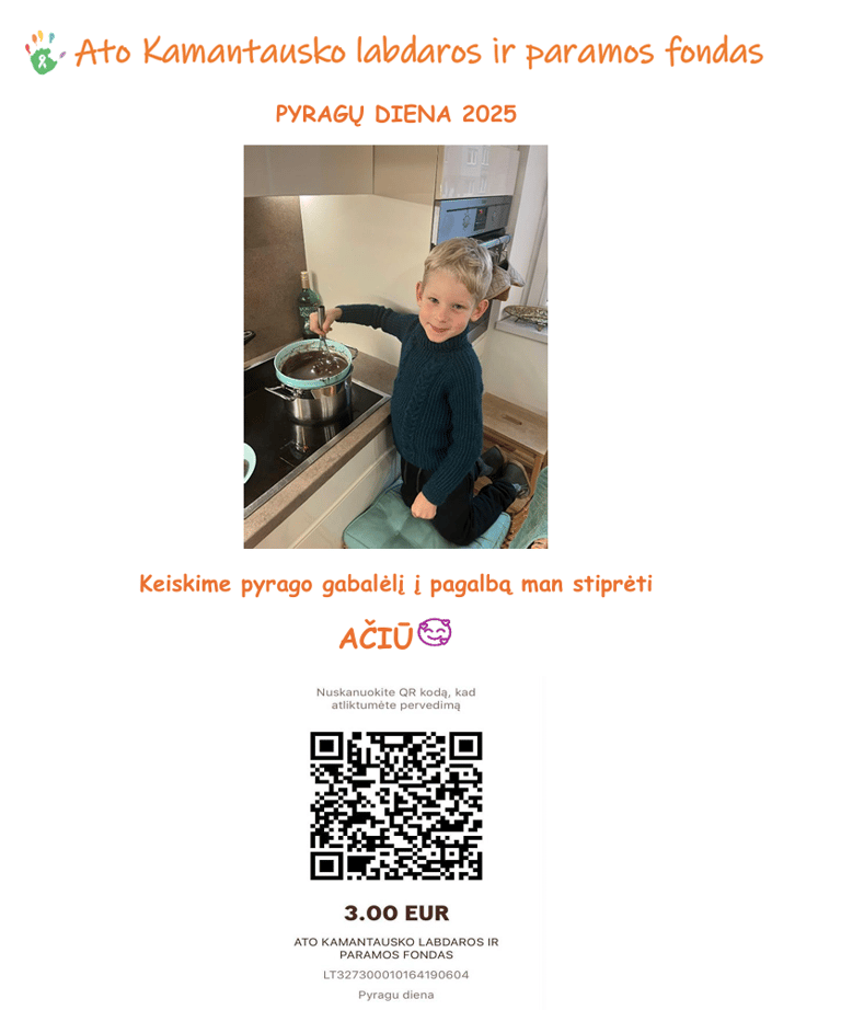 Lapkričio 6 d. vyks Pyragų diena - bendruomeniškumo ir gerų darbų diena! Renkame lėšas 2026 m intensyviai reabilitacijai su užsienio specialistais (reikalinga suma - 5 tūkst. eur). Labai kviečiame savo kolektyve minint šią dieną ir skanaujant pyragus, simboliškai prisidėti prie Ato reabilitacijų. Jūsų geru darbu būtinai pasidalinsime savo socialiniuose tinkluose. Kadangi visų pavaišinti pyragu negalime, loterijos būdu pavaišinsime 5-kis laiminguosius Ato gamintais pyragais :)